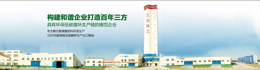 山東三方化工集團有限公司是一家以生產(chǎn)化肥為主,集化工、科研、房產(chǎn)開發(fā)、金融商貿(mào)及農(nóng)化服務于一體的大型集團化企業(yè)。公司成立于1975年,現(xiàn)有總資產(chǎn)8億元,職工1200余人,占地面積1000余畝。主要產(chǎn)品有復合肥、硫酸鉀、鹽酸、精細化工等產(chǎn)品,年綜合生產(chǎn)能力120萬噸,是北方主要的曼海姆法硫酸鉀生產(chǎn)基地,產(chǎn)品遠銷日本、澳大利亞、埃及、東南亞等海外國家和地區(qū)。