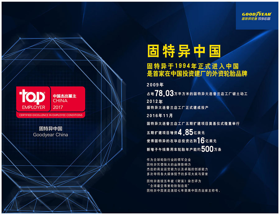 美國固特異輪胎于1994年9月率先進(jìn)入中國市場,在大連創(chuàng)建了大連固特異輪胎有限公司,成為第一家來華投資建廠的西方輪胎企業(yè)。2008年11月,固特異大連通過股份收購成為固特異的獨(dú)資公司。截至目前,固特異在中國已擁有2600多名員工。