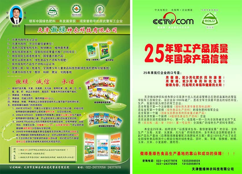 傲綠公司堅持“以質(zhì)量求生存,靠信譽謀發(fā)展”的企業(yè)宗旨,一定讓全國的農(nóng)民朋友:用神奇的傲綠,創(chuàng)造綠色奇跡!