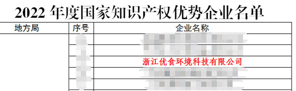 近日,國家知識產權局發(fā)布了《關于確定2022年新一批及通過復核的國家知識產權示范企業(yè)和優(yōu)勢企業(yè)的通知》通知,浙江優(yōu)食環(huán)境科技有限公司榮獲“2022年度國家知識產權優(yōu)勢企業(yè)”的稱號。