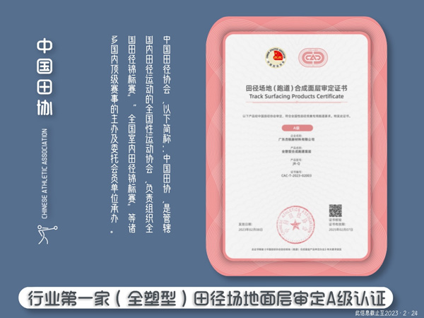 杰銳體育獲全塑型田協(xié)審定A級;面層審定數(shù)量眾多;世界田徑面層系統(tǒng)認(rèn)證數(shù)量國內(nèi)名列前茅!