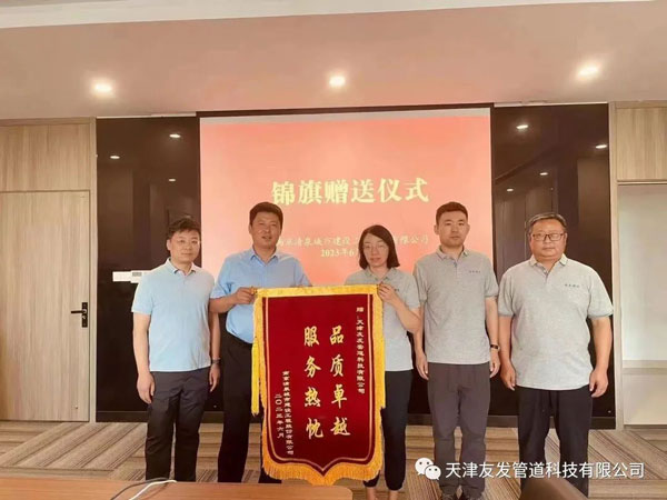 2023年6月,南京清泉城市建設工程股份有限公司送予天津友發(fā)管道科技有限公司“品質卓越 服務熱忱”的錦旗,對我公司產品質量及售后服務表示認可和感謝。