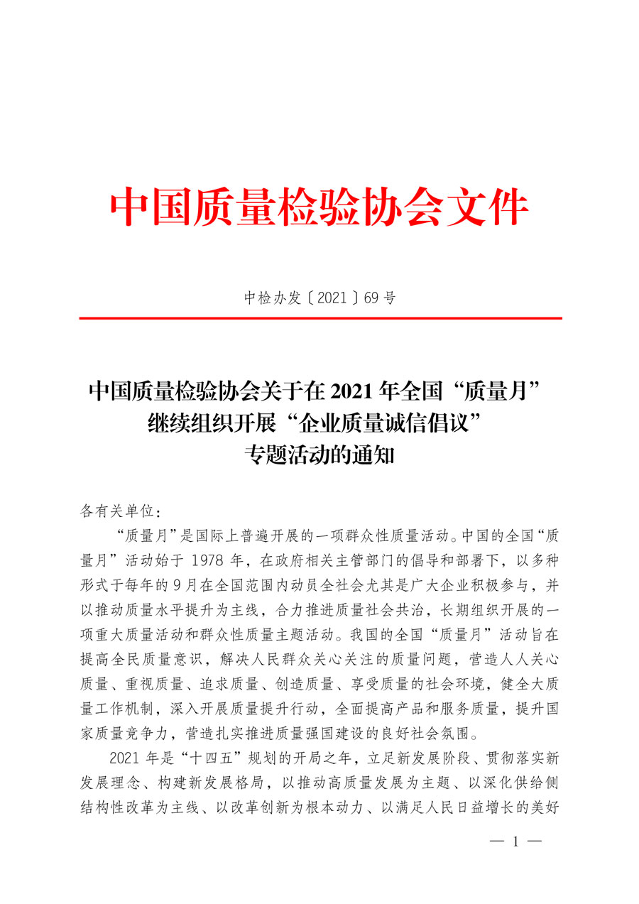 “持續(xù)推進(jìn)‘三個轉(zhuǎn)變’重要思想,助力提高中國質(zhì)量國際影響力和國際競爭力,為中國質(zhì)量走向世界提供服務(wù),發(fā)揮質(zhì)量檢驗對提升國家核心競爭力的重要作用,為我國經(jīng)濟(jì)社會全面、協(xié)調(diào)、可持續(xù)健康發(fā)展服務(wù)”是章程賦予中國質(zhì)量檢驗協(xié)會的職能。中國質(zhì)量檢驗協(xié)會為充分發(fā)揮質(zhì)量檢驗行業(yè)組織和質(zhì)量專業(yè)社團(tuán)機構(gòu)在推動中國經(jīng)濟(jì)高質(zhì)量發(fā)展中的橋梁和紐帶作用,深入開展質(zhì)量提升行動,扎實做好“六穩(wěn)”工作、全面落實“六保”任務(wù),努力開創(chuàng)社團(tuán)中介組織在新發(fā)展階段的新作用,激發(fā)市場主體活力,發(fā)揮質(zhì)量先進(jìn)示范作用,引導(dǎo)企業(yè)不斷增強質(zhì)量意識和誠信意識,督促企業(yè)落實質(zhì)量安全責(zé)任,合力推進(jìn)質(zhì)量社會共治,堅持質(zhì)量第一、抓好質(zhì)量提升,共筑質(zhì)量誠信、建設(shè)質(zhì)量強國,經(jīng)研究決定繼續(xù)組織一批堅持質(zhì)量第一的發(fā)展理念,崇尚誠實守信、創(chuàng)新發(fā)展、追求卓越的質(zhì)量文化,不斷加強全面質(zhì)量管理,質(zhì)量管理制度、模式和方法成熟度高,質(zhì)量水平和管理水平在所屬領(lǐng)域或行業(yè)內(nèi)領(lǐng)先的質(zhì)量誠信先進(jìn)示范企業(yè)和貫徹落實新發(fā)展理念、著力提升產(chǎn)品和服務(wù)質(zhì)量、重視品牌建設(shè)、不斷提升質(zhì)量效益和核心競爭力、積極履行社會責(zé)任的質(zhì)量效益顯著標(biāo)桿典型優(yōu)秀企業(yè)在2021年全國“質(zhì)量月”活動中開展“企業(yè)質(zhì)量誠信倡議”專題活動。