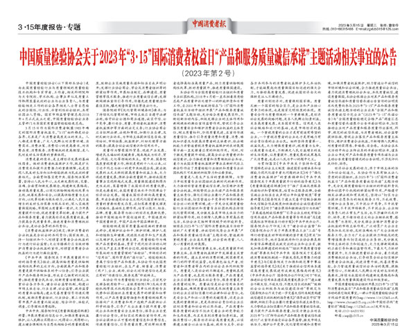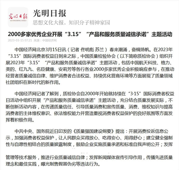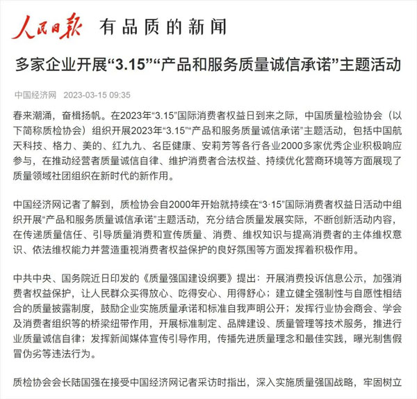 ——中國質量檢驗協(xié)會組織2000多家優(yōu)秀典范企業(yè)開展“3.15”產品和服務質量誠信承諾活動