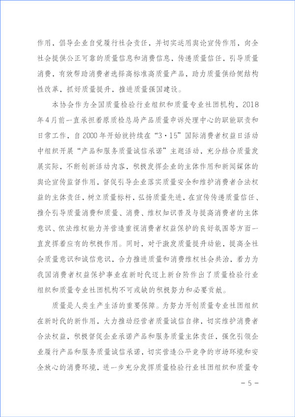 本協(xié)會作為全國質量檢驗行業(yè)組織和質量專業(yè)社團機構,2018年4月前一直承擔著原質檢總局產品質量申訴處理中心的職能職責和日常工作,自2000年開始就持續(xù)在“3·15”國際消費者權益日活動中組織開展“產品和服務質量誠信承諾”主題活動,充分結合質量發(fā)展實際,不斷創(chuàng)新活動內容,積極發(fā)揮企業(yè)的主體作用和新聞媒體的輿論宣傳監(jiān)督作用,督促引導企業(yè)落實質量安全和維護消費者合法權益的主體責任,樹立質量標桿,弘揚質量先進,在宣傳傳遞質量信任、推介引導質量消費和質量、消費、維權知識普及與提高消費者的主體意識、依法維權能力并營造重視消費者權益保護的良好氛圍等方面一直發(fā)揮著應有的積極作用。同時,對于激發(fā)質量提升動能,提高全社會質量意識和誠信意識,合力推進質量和消費維權社會共治,著力為我國消費者權益保護事業(yè)在新時代邁上新臺階作出了質量檢驗行業(yè)組織和質量專業(yè)社團機構不可或缺的積極努力和必要貢獻。