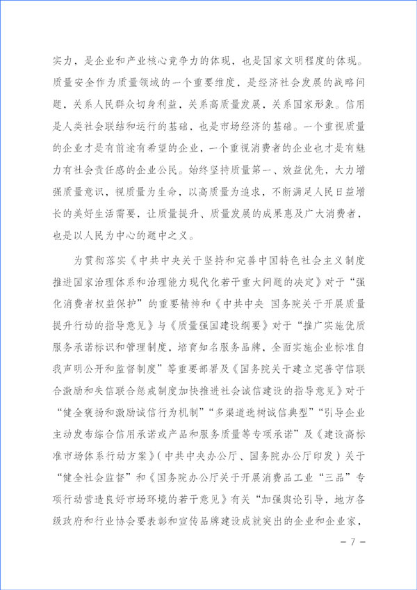 質量興則經(jīng)濟興,質量強則國家強。質量反映一個國家的綜合實力,是企業(yè)和產業(yè)核心競爭力的體現(xiàn),也是國家文明程度的體現(xiàn)。質量安全作為質量領域的一個重要維度,是經(jīng)濟社會發(fā)展的戰(zhàn)略問題,關系人民群眾切身利益,關系高質量發(fā)展,關系國家形象。信用是人類社會聯(lián)結和運行的基礎,也是市場經(jīng)濟的基礎。一個重視質量的企業(yè)才是有前途有希望的企業(yè),一個重視消費者的企業(yè)也才是有魅力有社會責任感的企業(yè)公民。始終堅持質量第一、效益優(yōu)先,大力增強質量意識,視質量為生命,以高質量為追求,不斷滿足人民日益增長的美好生活需要,讓質量提升、質量發(fā)展的成果惠及廣大消費者,也是以人民為中心的題中之義。