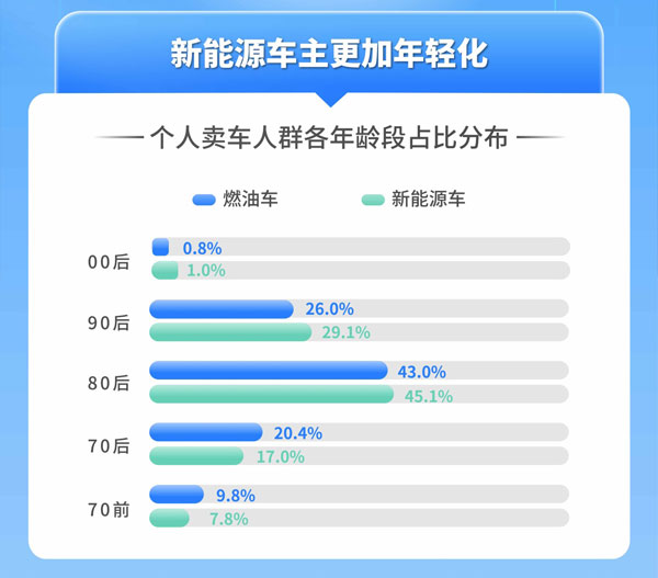 據(jù)天天拍車數(shù)據(jù)顯示,個人賣車車主年齡段分布占比,新能源車車主80后占比45.1%,90后占比29.1%,00后占比1.0%,對應(yīng)燃油車車主占比分別為43.0%,26.0%,0.8%。在越來越成熟的新能源汽車技術(shù)和促消費(fèi)政策的加持下,新能源汽車保有量不斷增加,確保了二手車市場交易中新能源二手車車源充足,不少消費(fèi)者在兼顧嘗“新”和性價比的心態(tài)下,選擇消費(fèi)新能源二手車,不失為一個比較理性的消費(fèi)心理。