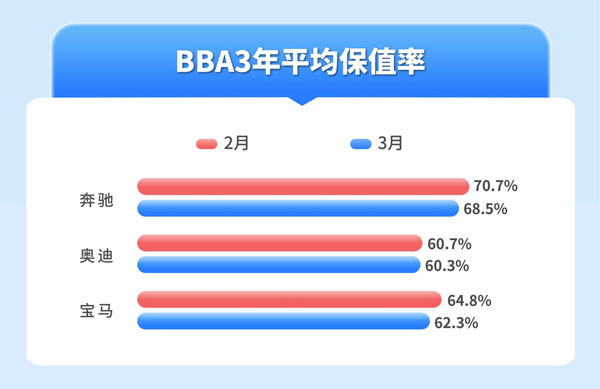 寶馬、奔馳、奧迪品牌是消費(fèi)者熱衷的豪華汽車品牌,在二手車市場交易熱度較高,也是二手車經(jīng)銷商收車較多的類型。3月BBA品牌3年平均保值率行情,表現(xiàn)最高的是奔馳品牌,其3年平均保值率為68.5%,較2月下滑2.2%;其次是寶馬品牌,其3年平均保值率為62.3%,較2月下跌2.5%;奧迪品牌3年平均保值率為60.3%,較2月微跌0.4%。