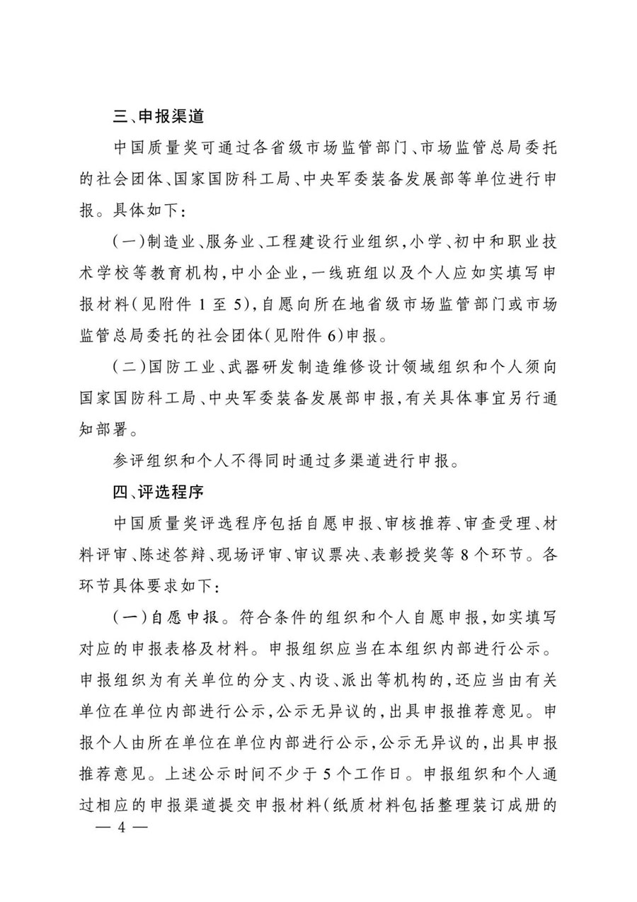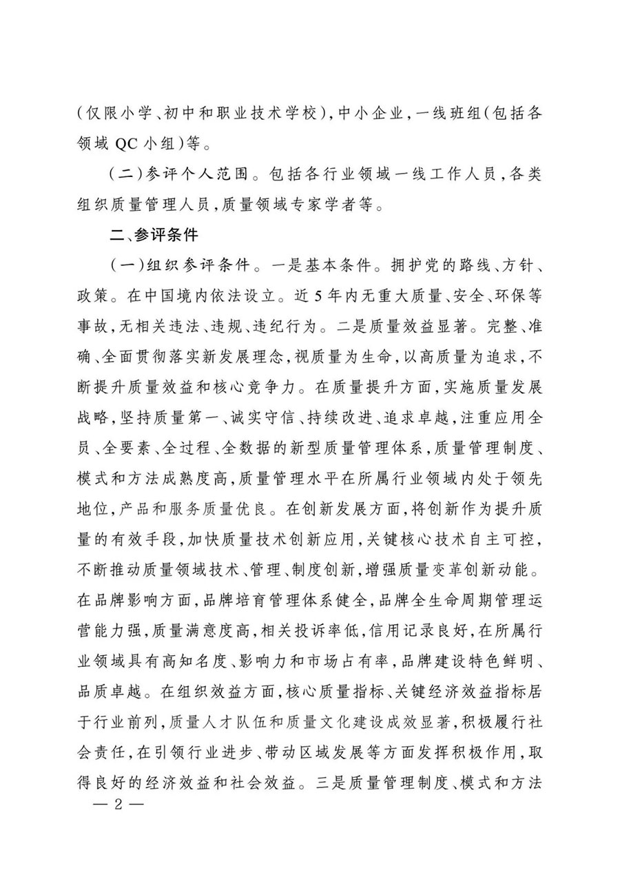 (一)組織參評(píng)條件。一是基本條件。擁護(hù)黨的路線、方針、政策。在中國境內(nèi)依法設(shè)立。近5年內(nèi)無重大質(zhì)量、安全、環(huán)保等事故,無相關(guān)違法、違規(guī)、違紀(jì)行為。二是質(zhì)量效益顯著。完整、準(zhǔn)確、全面貫徹落實(shí)新發(fā)展理念,視質(zhì)量為生命,以高質(zhì)量為追求,不斷提升質(zhì)量效益和核心競爭力。在質(zhì)量提升方面,實(shí)施質(zhì)量發(fā)展戰(zhàn)略,堅(jiān)持質(zhì)量第一、誠實(shí)守信、持續(xù)改進(jìn)、追求卓越,注重應(yīng)用全員、全要素、全過程、全數(shù)據(jù)的新型質(zhì)量管理體系,質(zhì)量管理制度、模式和方法成熟度高,質(zhì)量管理水平在所屬行業(yè)領(lǐng)域內(nèi)處于領(lǐng)先地位,產(chǎn)品和服務(wù)質(zhì)量優(yōu)良。在創(chuàng)新發(fā)展方面,將創(chuàng)新作為提升質(zhì)量的有效手段,加快質(zhì)量技術(shù)創(chuàng)新應(yīng)用,關(guān)鍵核心技術(shù)自主可控,不斷推動(dòng)質(zhì)量領(lǐng)域技術(shù)、管理、制度創(chuàng)新,增強(qiáng)質(zhì)量變革創(chuàng)新動(dòng)能。在品牌影響方面,品牌培育管理體系健全,品牌全生命周期管理運(yùn)營能力強(qiáng),質(zhì)量滿意度高,相關(guān)投訴率低,信用記錄良好,在所屬行業(yè)領(lǐng)域具有高知名度、影響力和市場占有率,品牌建設(shè)特色鮮明、品質(zhì)卓越。在組織效益方面,核心質(zhì)量指標(biāo)、關(guān)鍵經(jīng)濟(jì)效益指標(biāo)居于行業(yè)前列,質(zhì)量人才隊(duì)伍和質(zhì)量文化建設(shè)成效顯著,積極履行社會(huì)責(zé)任,在引領(lǐng)行業(yè)進(jìn)步、帶動(dòng)區(qū)域發(fā)展等方面發(fā)揮積極作用,取得良好的經(jīng)濟(jì)效益和社會(huì)效益。三是質(zhì)量管理制度、模式和方法可示范可推廣。通過質(zhì)量管理創(chuàng)新,結(jié)合實(shí)踐總結(jié)提煉出獨(dú)具特色、國內(nèi)領(lǐng)先、國際先進(jìn)且具有應(yīng)用推廣價(jià)值的質(zhì)量管理制度、模式和方法。發(fā)揮引領(lǐng)作用,將質(zhì)量管理的成功經(jīng)驗(yàn)和先進(jìn)方法向全行業(yè)和產(chǎn)業(yè)鏈兩端延伸推廣,推動(dòng)加強(qiáng)全面質(zhì)量管理,促進(jìn)質(zhì)量升級(jí),為建設(shè)現(xiàn)代化產(chǎn)業(yè)體系作出貢獻(xiàn)。