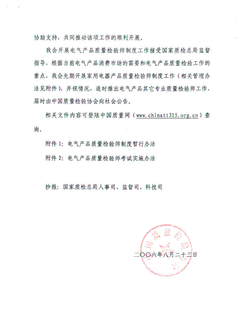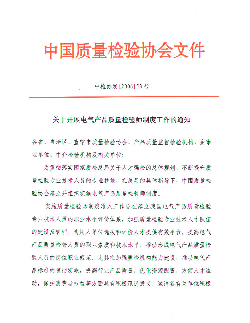 關(guān)于開(kāi)展電氣產(chǎn)品質(zhì)量檢驗(yàn)師制度工作的通知