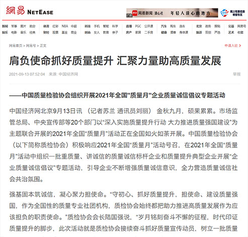 新浪網(wǎng):肩負(fù)使命抓好質(zhì)量提升 匯聚力量助高質(zhì)量發(fā)展——中國質(zhì)量檢驗協(xié)會組織開展2021年全國“質(zhì)量月”企業(yè)質(zhì)量誠信倡議專題活動