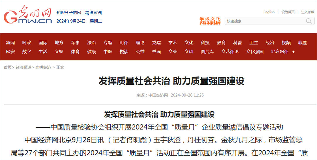 - 中國經(jīng)濟網(wǎng)—發(fā)揮質(zhì)量社會共治 助力質(zhì)量強國建設(shè)——中國質(zhì)量檢驗協(xié)會組織開展2024年全國“質(zhì)量月”企業(yè)質(zhì)量誠信倡議專題活動